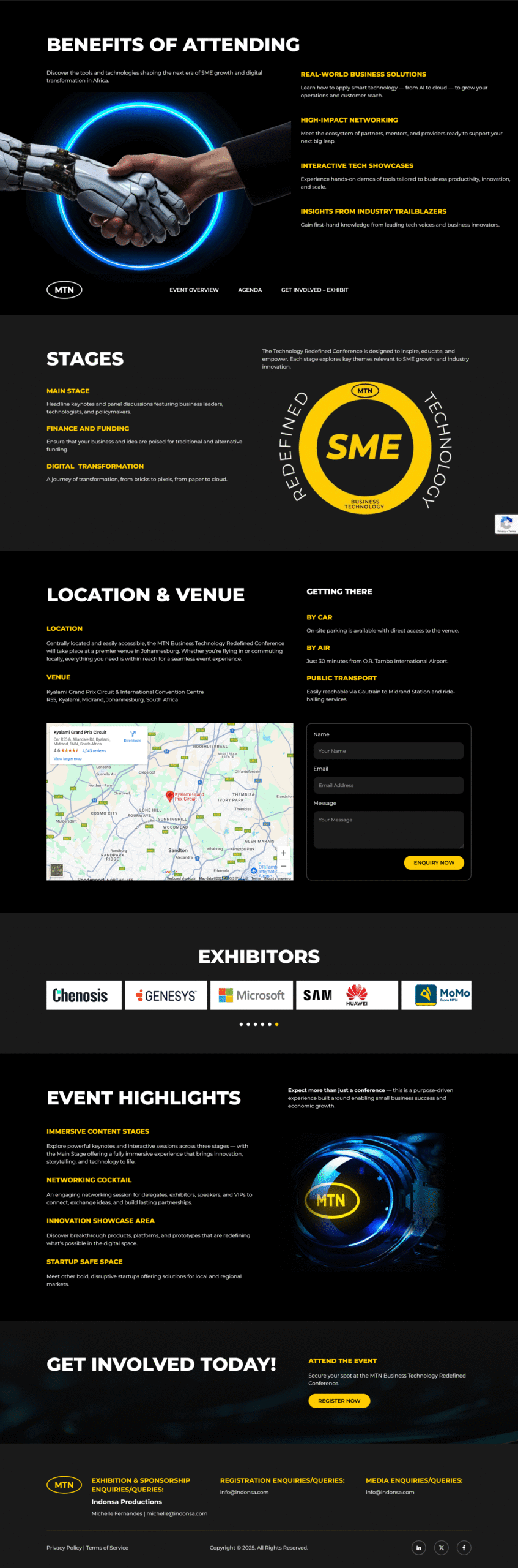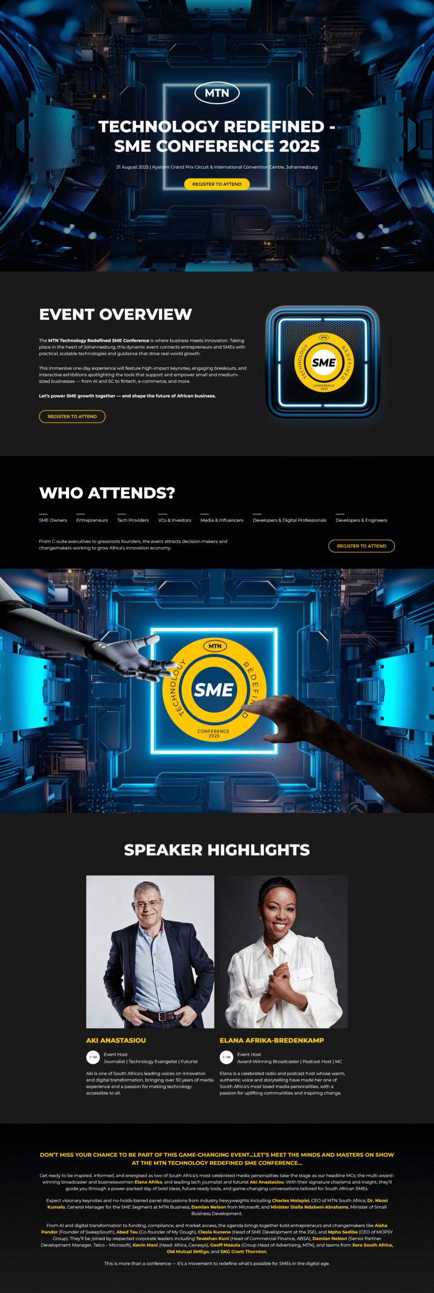 I designed and developed a stunning, conversion-focused landing page for MTN to introduce their upcoming conference. Built with Elementor and Advanced Custom Fields (ACF), the page combines modern design with dynamic functionality, ensuring easy updates and scalability. The layout highlights key conference details, engaging visuals, and clear calls-to-action to maximize registrations and audience engagement. Fully responsive and optimized, this landing page provides a seamless user experience across all devices.